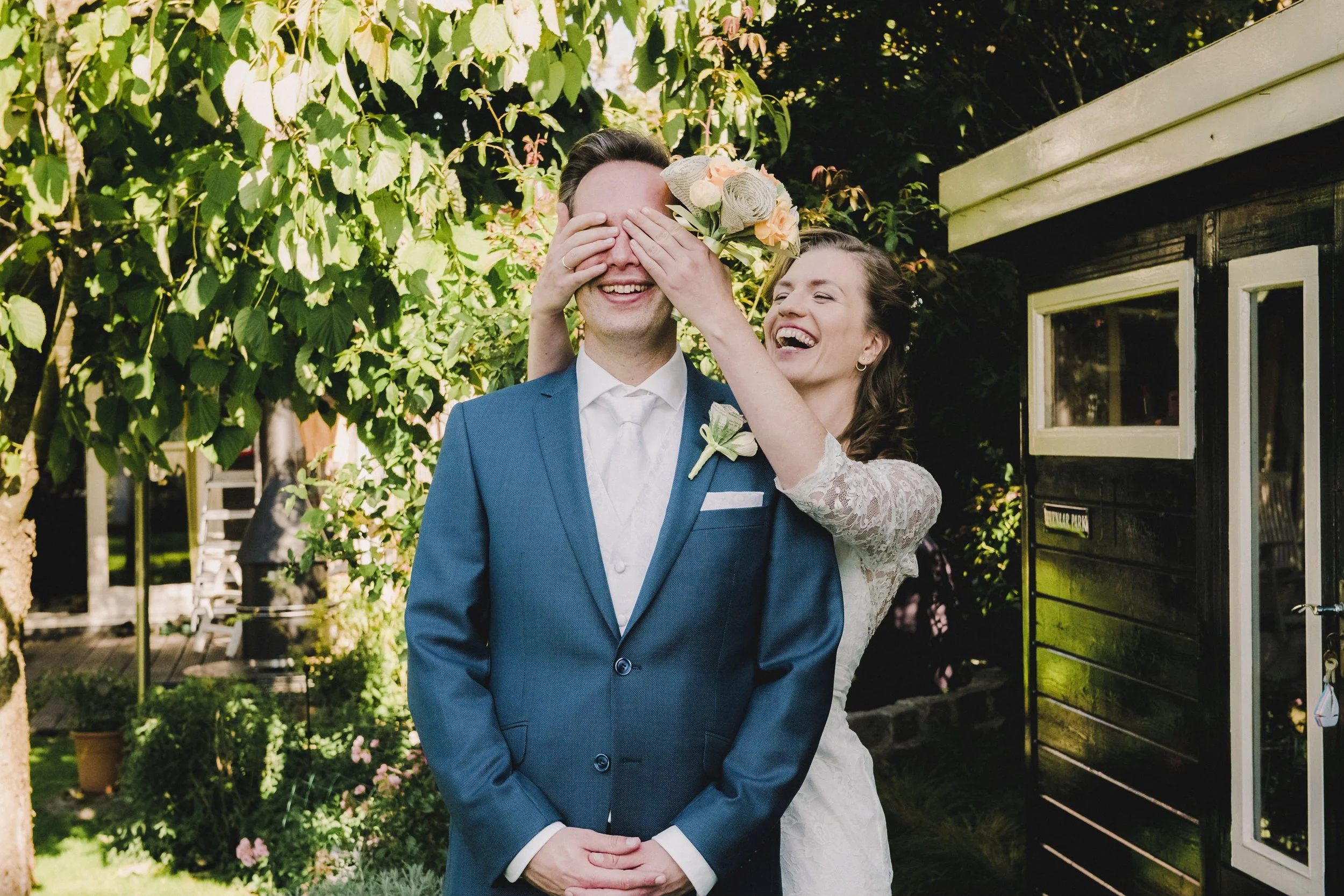 De dag heeft leuke verrassingen en originaliteiten: Anne heeft een bruidsboeket dat is gemaakt van papier en ze draagt als bruidsschoenen All Stars gympen. Ik hou ervan als mensen gewaagde en unieke keuzes durven te maken. Nadat we de ‘first look’ gefotografeerd hebben maken we een mooie serie met familiefoto’s in de tuin. Daarna is het tijd om naar Utrecht te gaan.